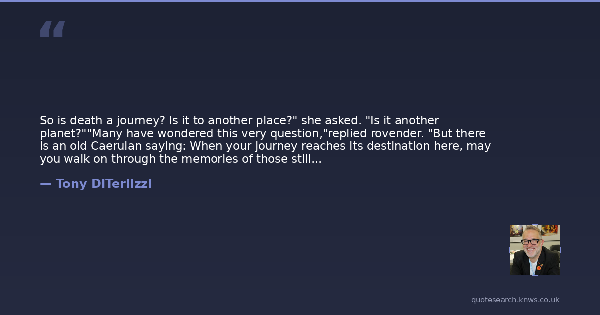 So is death a journey? Is it to another place?" she asked. "Is it another planet?""Many have wondered this very question,"replied rovender. "But there is an old Caerulan saying: When your journey reaches its destination here, may you walk on through the memories of those still with us.