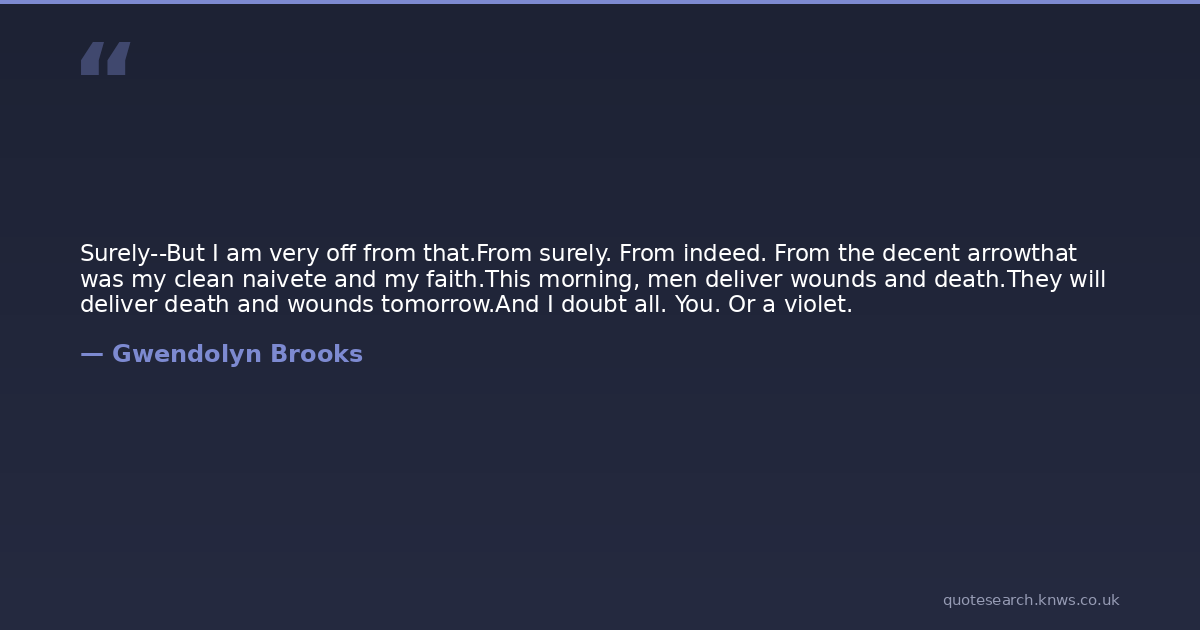 Surely--But I am very off from that.From surely. From indeed. From the decent arrowthat was my clean naivete and my faith.This morning, men deliver wounds and death.They will deliver death and wounds tomorrow.And I doubt all. You. Or a violet.