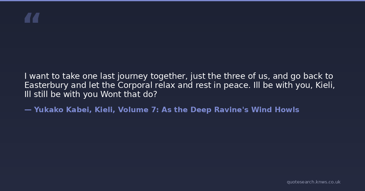I want to take one last journey together, just the three of us, and go back to Easterbury and let the Corporal relax and rest in peace. Ill be with you, Kieli, Ill still be with you Wont that do?