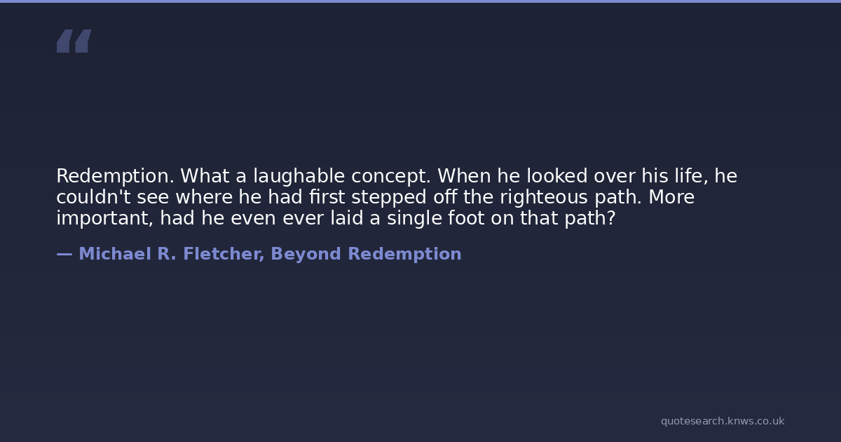 Redemption. What a laughable concept. When he looked over his life, he couldn't see where he had first stepped off the righteous path. More important, had he even ever laid a single foot on that path?