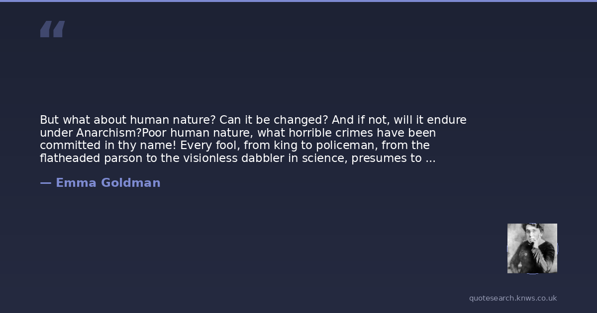But what about human nature? Can it be changed? And if not, will it endure under Anarchism?Poor human nature, what horrible crimes have been committed in thy name! Every fool, from king to policeman, from the flatheaded parson to the visionless dabbler in science, presumes to speak authoritatively of human nature. The greater the mental charlatan, the more definite his insistence on the wickedness and weaknesses of human nature. Yet, how can any one speak of it today, with every soul in a prison, with every heart fettered, wounded, and maimed?John Burroughs has stated that experimental study of animals in captivity is absolutely useless. Their character, their habits, their appetites undergo a complete transformation when torn from their soil in field and forest. With human nature caged in a narrow space, whipped daily into submission, how can we speak of its potentialities?Freedom, expansion, opportunity, and, above all, peace and repose, alone can teach us the real dominant factors of human nature and all its wonderful possibilities.Anarchism, then, really stands for the liberation of the human mind from the dominion of religion; the liberation of the human body from the dominion of property; liberation from the shackles and restraint of government. Anarchism stands for a social order based on the free grouping of individuals for the purpose of producing real social wealth; an order that will guarantee to every human being free access to the earth and full enjoyment of the necessities of life, according to individual desires, tastes, and inclinations.This is not a wild fancy or an aberration of the mind. It is the conclusion arrived at by hosts of intellectual men and women the world over; a conclusion resulting from the close and studious observation of the tendencies of modern society: individual liberty and economic equality, the twin forces for the birth of what is fine and true in man.