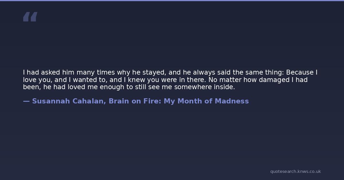 I had asked him many times why he stayed, and he always said the same thing: Because I love you, and I wanted to, and I knew you were in there. No matter how damaged I had been, he had loved me enough to still see me somewhere inside.