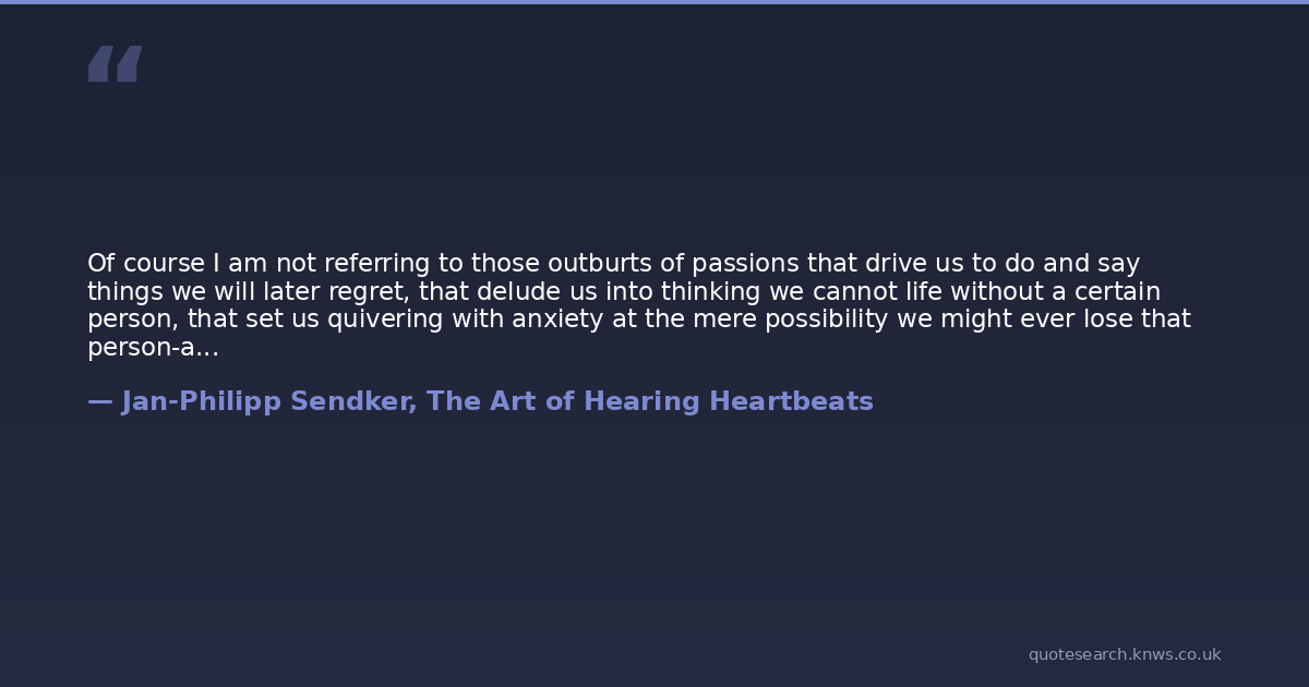 Of course I am not referring to those outburts of passions that drive us to do and say things we will later regret, that delude us into thinking we cannot life without a certain person, that set us quivering with anxiety at the mere possibility we might ever lose that person-a feeling that impoverishes rather than enriches us because we long to possess what we cannot, to hold on what we cannot.No. I speak of a love that brings sight to the blind. Of a love stronger than fear. I speak of a love that breathes meaning into life, that defies the natural laws of deterioration, that causes us to flourish, that knows no bounds. I speak of the triumph of the human spirit over selfishness and death.