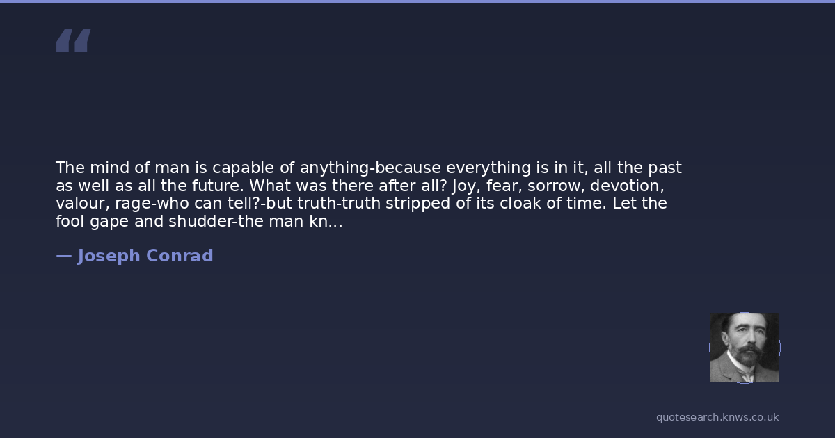 The mind of man is capable of anything-because everything is in it, all the past as well as all the future. What was there after all? Joy, fear, sorrow, devotion, valour, rage-who can tell?-but truth-truth stripped of its cloak of time. Let the fool gape and shudder-the man know, and can look on without a wink. But he must at least be as much of a man as these on the shore. He must meet the truth with his own true stuff-with his own inborn strength.