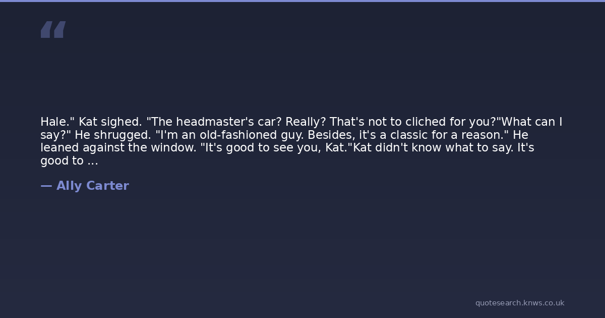 Hale." Kat sighed. "The headmaster's car? Really? That's not to cliched for you?"What can I say?" He shrugged. "I'm an old-fashioned guy. Besides, it's a classic for a reason." He leaned against the window. "It's good to see you, Kat."Kat didn't know what to say. It's good to see you, too? Thanks for getting me kicked out? Is it possible you've gotten even hotter? I think I might have missed you?