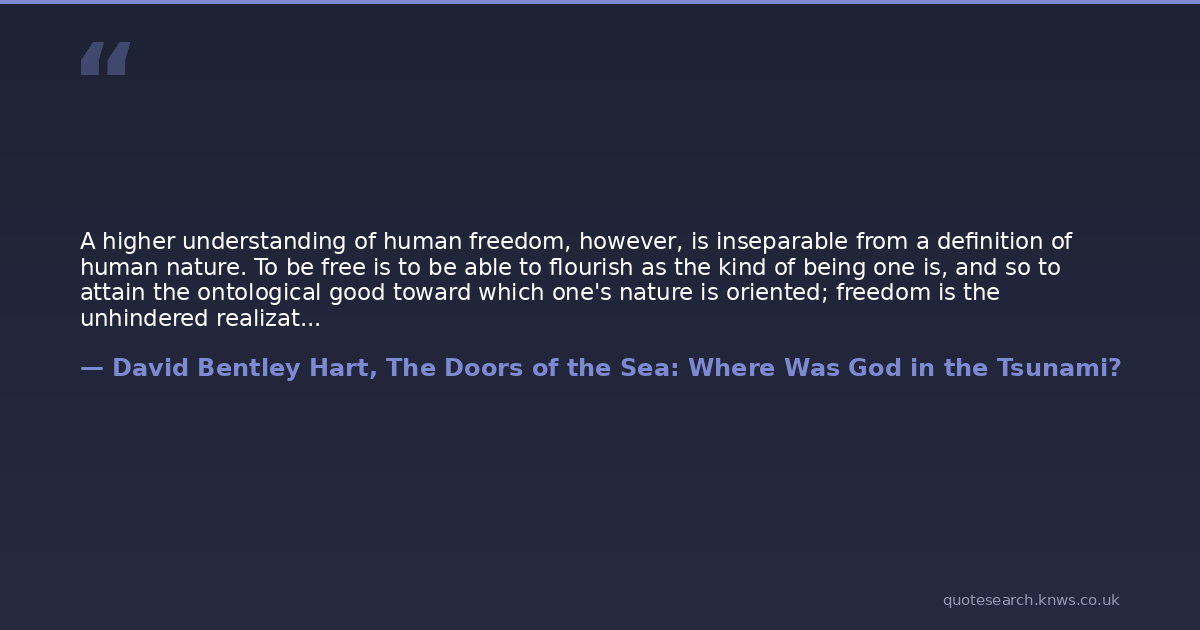 A higher understanding of human freedom, however, is inseparable from a definition of human nature. To be free is to be able to flourish as the kind of being one is, and so to attain the ontological good toward which one's nature is oriented; freedom is the unhindered realization of a complex nature in its proper end (natural and supernatural), and this is consummate liberty and happiness. The will that chooses poorly, then - through ignorance, maleficence, or corrupt desire - has not thereby become freer, but has further enslaved itself to those forces that prevent it from achieving its full expression. And it is this richer understanding of human freedom that provides us some analogy to the freedom of God. For God is infinite actuality, the source and end of all being, the eternally good, for whom mere arbitrary 'choice' - as among possibilities that somehow exceed his 'present' actuality - would be a deficiency, a limitation placed upon his infinite power to be God. His freedom is the impossibility of any force, pathos, or potentiality interrupting the perfection of his nature or hindering him in the realization of his own illimitable goodness, in himself and in his creatures. To be 'capable' of evil - to be able to do evil or to be affected by an encounter with it - would in fact be an incapacity in God; and to require evil to bring about his good ends would make him less than the God he is. The object of God's will is his own infinite goodness, and it is an object perfectly realized, and so he is FREE.