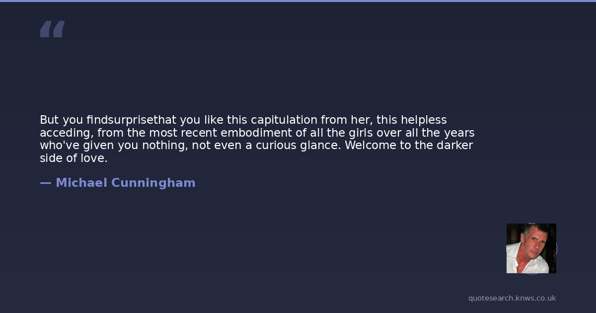 But you findsurprisethat you like this capitulation from her, this helpless acceding, from the most recent embodiment of all the girls over all the years who've given you nothing, not even a curious glance. Welcome to the darker side of love.