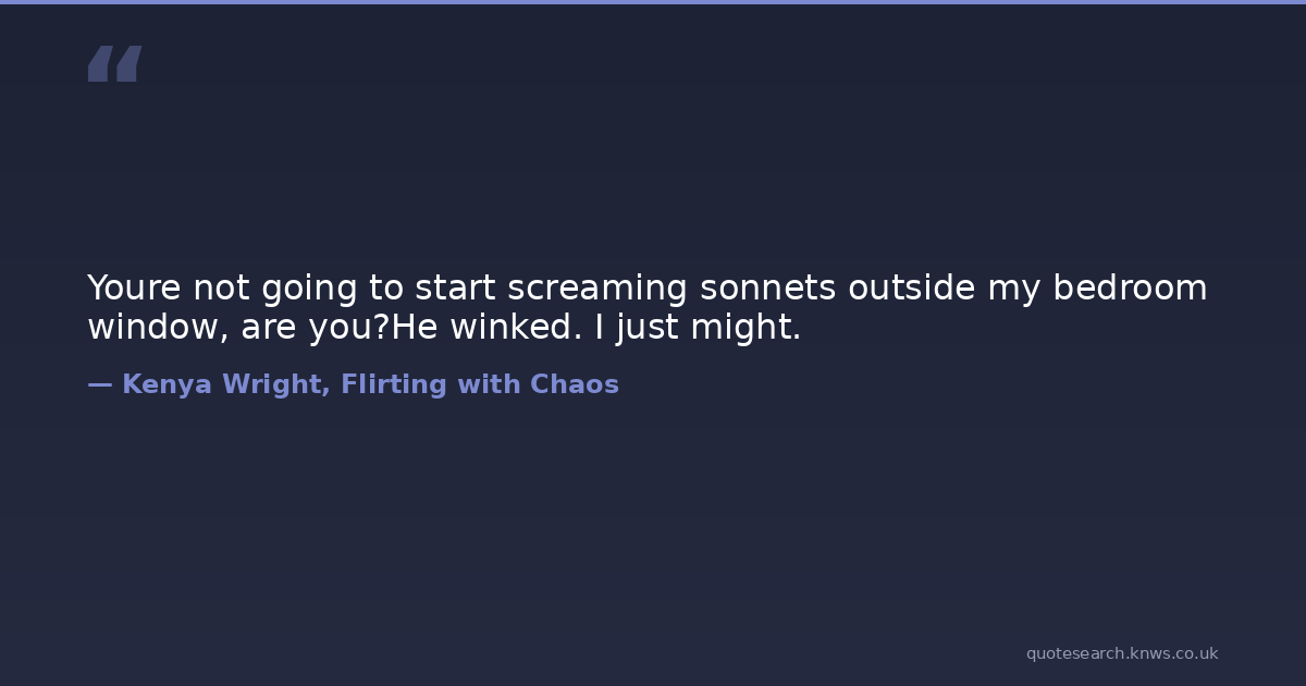 Youre not going to start screaming sonnets outside my bedroom window, are you?He winked. I just might.