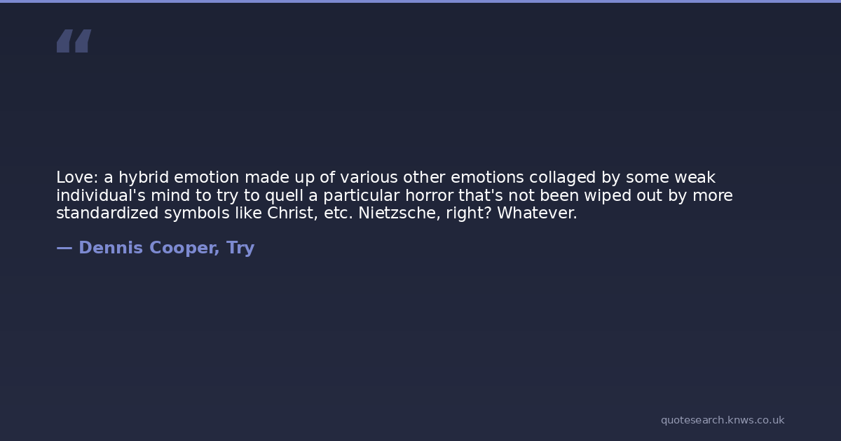 Love: a hybrid emotion made up of various other emotions collaged by some weak individual's mind to try to quell a particular horror that's not been wiped out by more standardized symbols like Christ, etc. Nietzsche, right? Whatever.