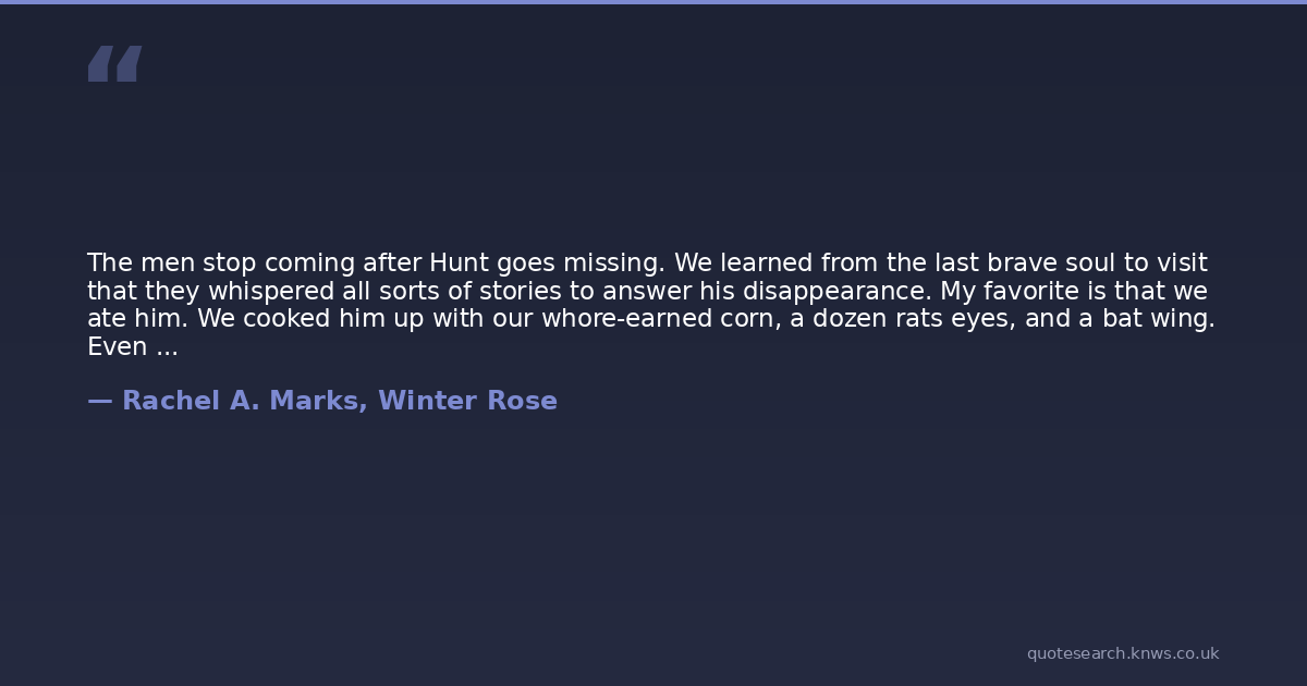 The men stop coming after Hunt goes missing. We learned from the last brave soul to visit that they whispered all sorts of stories to answer his disappearance. My favorite is that we ate him. We cooked him up with our whore-earned corn, a dozen rats eyes, and a bat wing. Even I couldnt have thought of anything more perfect.