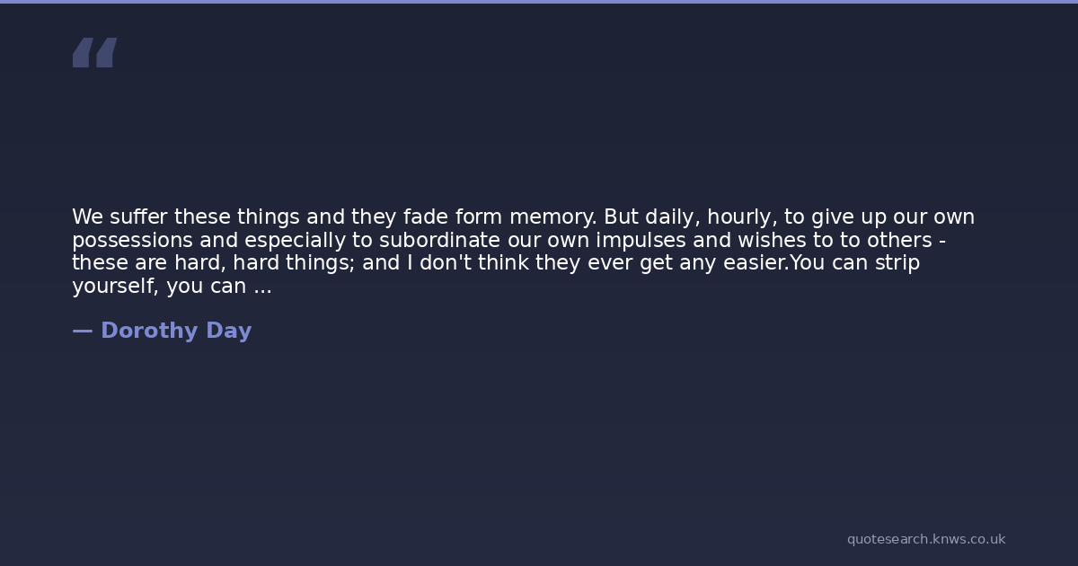 We suffer these things and they fade form memory. But daily, hourly, to give up our own possessions and especially to subordinate our own impulses and wishes to to others - these are hard, hard things; and I don't think they ever get any easier.You can strip yourself, you can be stripped, but still you will reach out like an octopus to seek your own comfort, your untroubled time, your ease, your refreshment. It may mean books or music - the gratification of the inner sense - or it may mean food and drink, coffee and cigarettes. The one kind of giving up is no easier than the other.