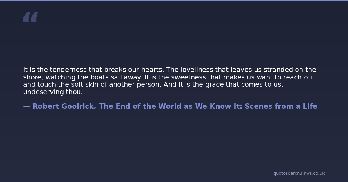 It is the tenderness that breaks our hearts. The loveliness that leaves us stranded on the shore, watching the boats sail away. It is the sweetness that makes us want to reach out and touch the soft skin of another person. And it is the grace that comes to us, undeserving though we may be.