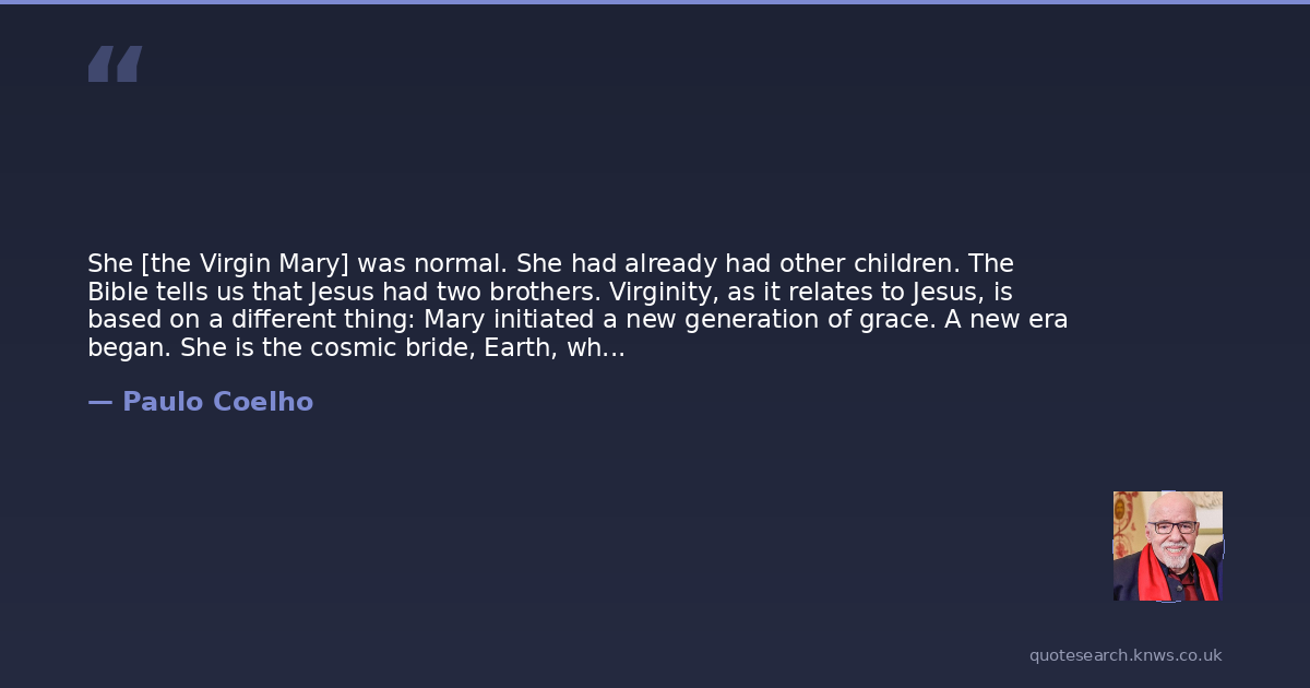 She [the Virgin Mary] was normal. She had already had other children. The Bible tells us that Jesus had two brothers. Virginity, as it relates to Jesus, is based on a different thing: Mary initiated a new generation of grace. A new era began. She is the cosmic bride, Earth, which opens to the heavens and allows itself to be fertilized.