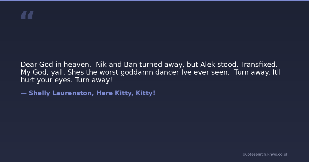 Dear God in heaven. Nik and Ban turned away, but Alek stood. Transfixed. My God, yall. Shes the worst goddamn dancer Ive ever seen. Turn away. Itll hurt your eyes. Turn away!