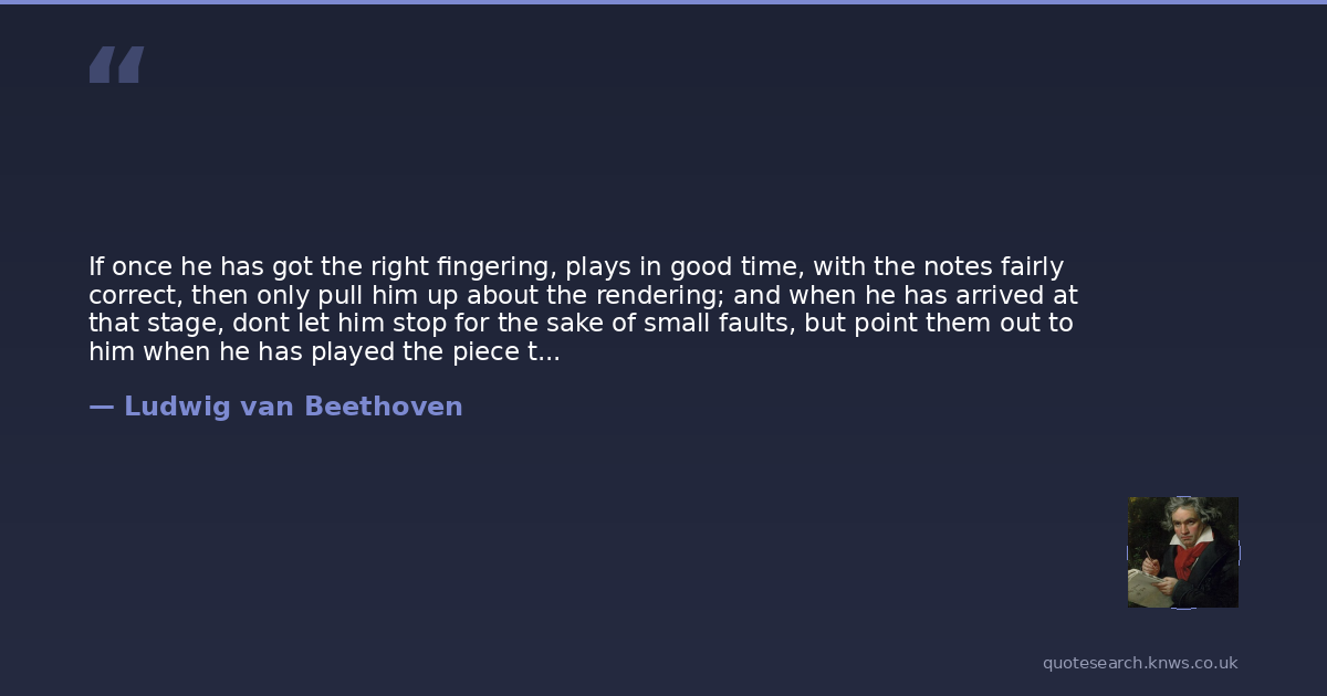 If once he has got the right fingering, plays in good time, with the notes fairly correct, then only pull him up about the rendering; and when he has arrived at that stage, dont let him stop for the sake of small faults, but point them out to him when he has played the piece through. . . I have always adopted this plan; it soon forms musicians which, after all, is one of the first aims of art and it gives less trouble both to master and pupil.