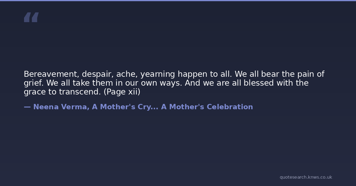 Bereavement, despair, ache, yearning happen to all. We all bear the pain of grief. We all take them in our own ways. And we are all blessed with the grace to transcend. (Page xii)