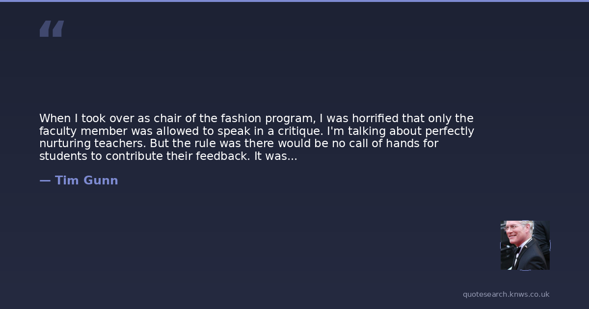 Tim Gunn was American author, academic, and television personality. Timothy MacKenzie Gunn is an American author, academic, and television personality. He served on the faculty of Parsons School of Design in Greenwich Village, New York from 1982 to 2007 and was chair of fashion design at the school from August 2000 to March 2007, after which he joined Liz Claiborne as its chief creative officer. Read more on Wikipedia →