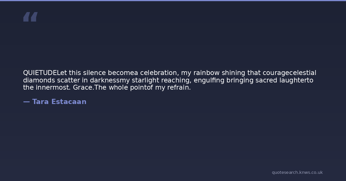 QUIETUDELet this silence becomea celebration, my rainbow shining that couragecelestial diamonds scatter in darknessmy starlight reaching, engulfing bringing sacred laughterto the innermost. Grace.The whole pointof my refrain.