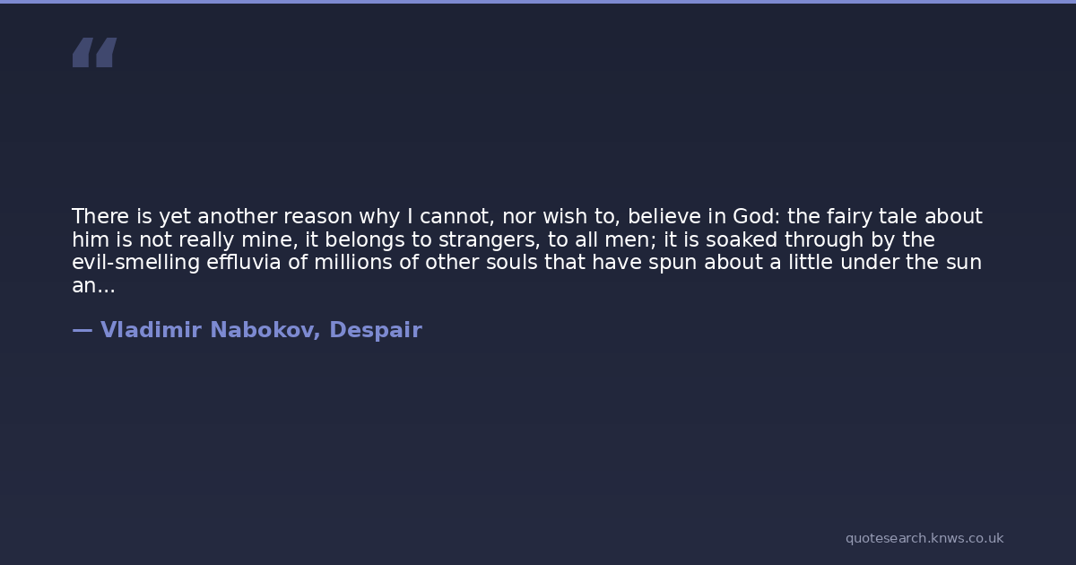 There is yet another reason why I cannot, nor wish to, believe in God: the fairy tale about him is not really mine, it belongs to strangers, to all men; it is soaked through by the evil-smelling effluvia of millions of other souls that have spun about a little under the sun and then burst