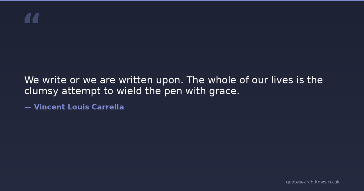 We write or we are written upon. The whole of our lives is the clumsy attempt to wield the pen with grace. action grace pens volition writing Download Image Share on X Share on Facebook Copy Link