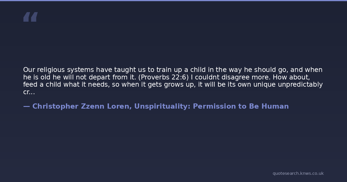 Our religious systems have taught us to train up a child in the way he should go, and when he is old he will not depart from it. (Proverbs 22:6) I couldnt disagree more. How about, feed a child what it needs, so when it gets grows up, it will be its own unique unpredictably creative self.