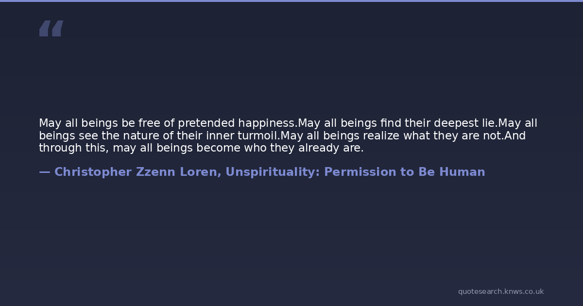 May all beings be free of pretended happiness.May all beings find their deepest lie.May all beings see the nature of their inner turmoil.May all beings realize what they are not.And through this, may all beings become who they already are.