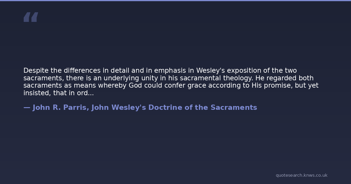 Despite the differences in detail and in emphasis in Wesley's exposition of the two sacraments, there is an underlying unity in his sacramental theology. He regarded both sacraments as means whereby God could confer grace according to His promise, but yet insisted, that in order to prevent the means from being mistaken as ends, it was necessary for there to be an appropriation of the grace held out by the faith of the believer. Grace was not conferred IN SPITE OF MAN, but only with his co-operation. So human response was necessary for the efficacy of the sacraments, although man's actions were never thought of as meritorious works.