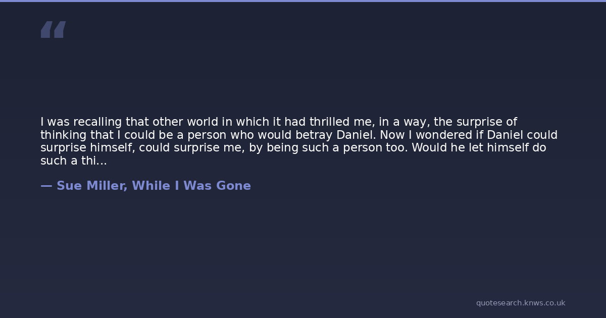 I was recalling that other world in which it had thrilled me, in a way, the surprise of thinking that I could be a person who would betray Daniel. Now I wondered if Daniel could surprise himself, could surprise me, by being such a person too. Would he let himself do such a thing? I didnt think so. And then I wondered: Is it by will, then, that we are who we are? Do we decide, do we make ourselves, after a certain point in life?I tried to call up the moment when I had decided I could be such a person. It seemed to me I hadnt quite got there, not really. That I was still just playing with the idea of it when the ground shifted under me. But perhaps to play with such an idea was already to be a certain kind of person.