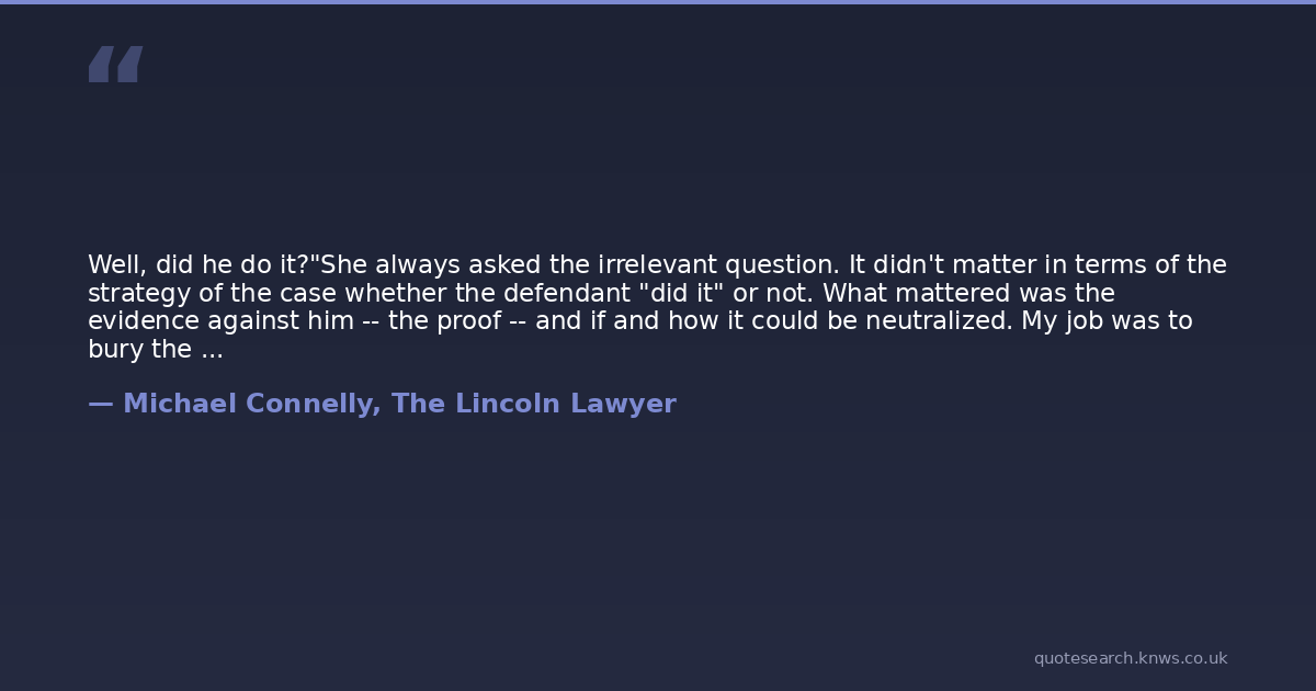 Well, did he do it?"She always asked the irrelevant question. It didn't matter in terms of the strategy of the case whether the defendant "did it" or not. What mattered was the evidence against him -- the proof -- and if and how it could be neutralized. My job was to bury the proof, to color the proof a shade of gray. Gray was the color of reasonable doubt.