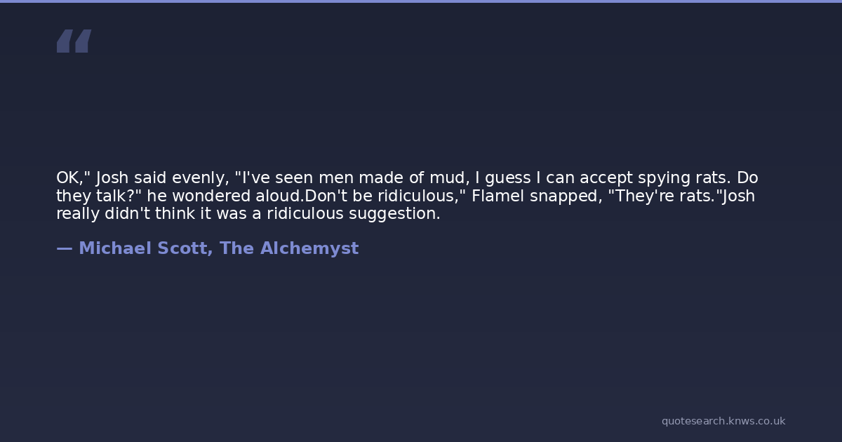 OK," Josh said evenly, "I've seen men made of mud, I guess I can accept spying rats. Do they talk?" he wondered aloud.Don't be ridiculous," Flamel snapped, "They're rats."Josh really didn't think it was a ridiculous suggestion.