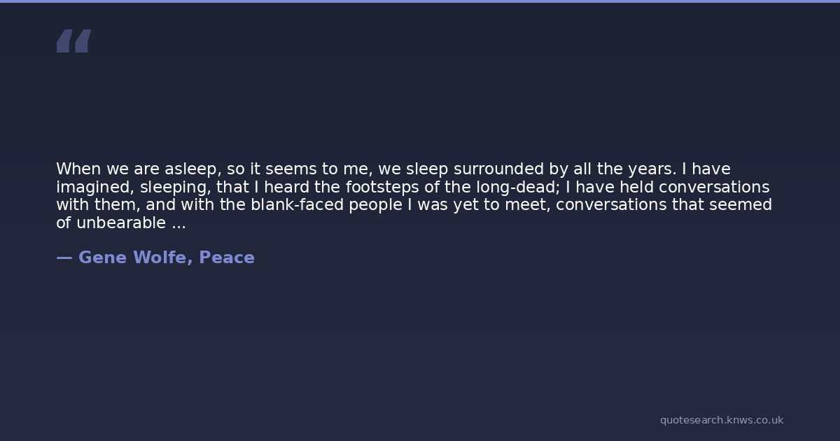 When we are asleep, so it seems to me, we sleep surrounded by all the years. I have imagined, sleeping, that I heard the footsteps of the long-dead; I have held conversations with them, and with the blank-faced people I was yet to meet, conversations that seemed of unbearable poignancy, though when I woke I could remember only a few words, and those not words that possessed, waking, any emotional significance to me. It is said that this is because content is divorced from emotion in sleep, as though the sleeping mind read two books at once, one of tears and lust and laughter, the other words and phrases picked up from old newspapers, from grimy handbills blowing along the street and conversations overheard in barbershops and bars, and the banalities of radio. I think rather that we have forgotten on waking what the words have meant to us, or have not learned as yet what they will mean. But the worst thing is to wake and remember that we have been talking to the dead, having never thought to hear that voice again, having never any expectation of hearing it again before we ourselves are gone.