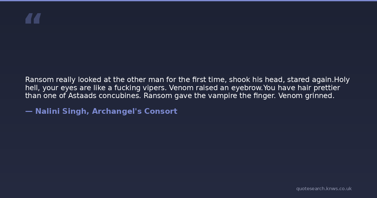 Ransom really looked at the other man for the first time, shook his head, stared again.Holy hell, your eyes are like a fucking vipers. Venom raised an eyebrow.You have hair prettier than one of Astaads concubines. Ransom gave the vampire the finger. Venom grinned.