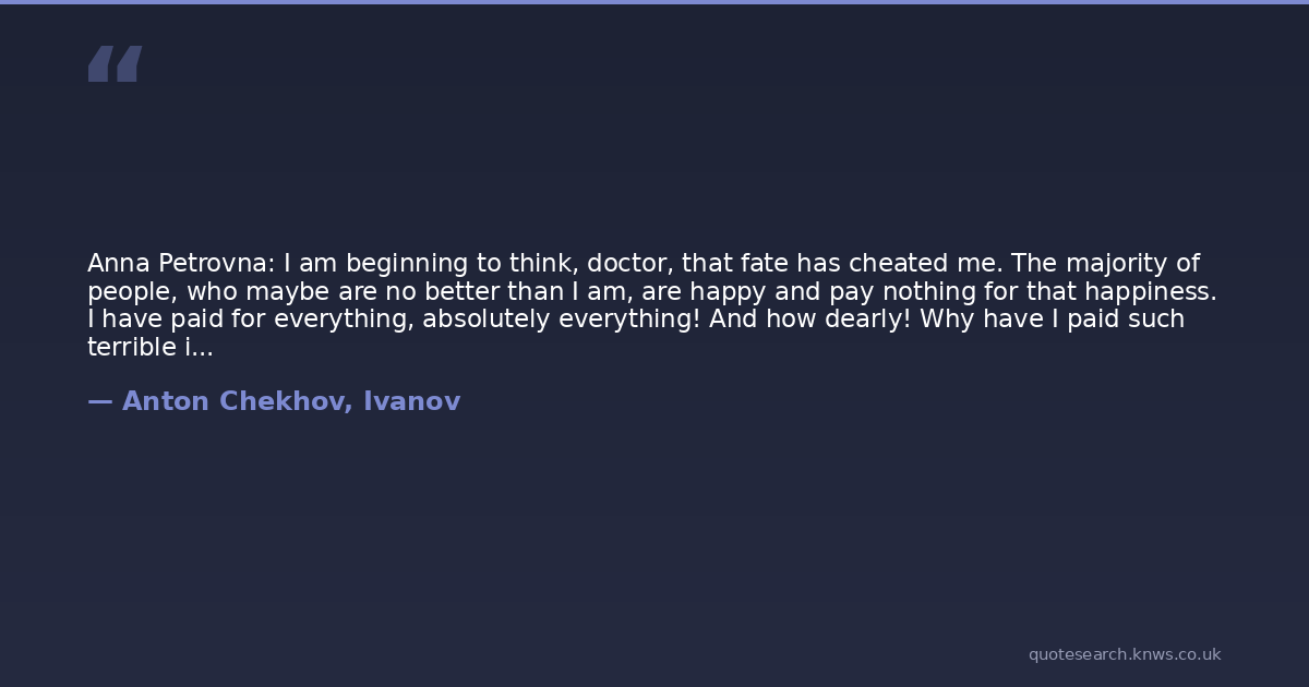 Anna Petrovna: I am beginning to think, doctor, that fate has cheated me. The majority of people, who maybe are no better than I am, are happy and pay nothing for that happiness. I have paid for everything, absolutely everything! And how dearly! Why have I paid such terrible interest?