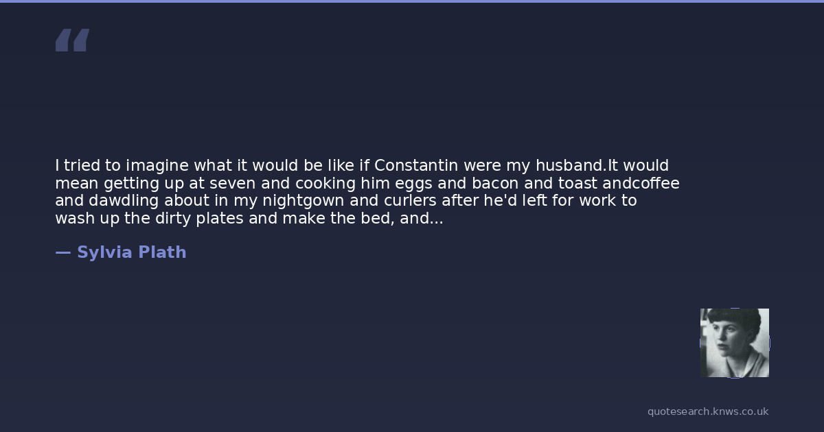 I tried to imagine what it would be like if Constantin were my husband.It would mean getting up at seven and cooking him eggs and bacon and toast andcoffee and dawdling about in my nightgown and curlers after he'd left for work to wash up the dirty plates and make the bed, and then when he came home after a lively, fascinating day he'd expect a big dinner, and I'd spend the evening washing up even more dirty plates till I fell into bed, utterly exhausted. This seemed a dreary and wasted life for a girl with fifteen years of straight A's, but I knew that's what marriage was like, because cook and clean and wash was just what Buddy Willard's mother did from morning till night, and she was the wife of a university professor and had been a private school teacher herself.