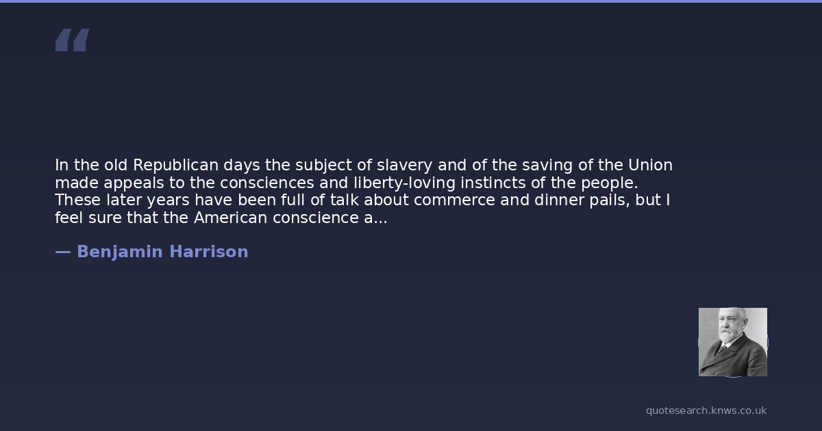 In the old Republican days the subject of slavery and of the saving of the Union made appeals to the consciences and liberty-loving instincts of the people. These later years have been full of talk about commerce and dinner pails, but I feel sure that the American conscience and the American love of liberty have not been smothered. They will break through this crust of sordidness and realize that those only keep their liberties who accord liberty to others.
