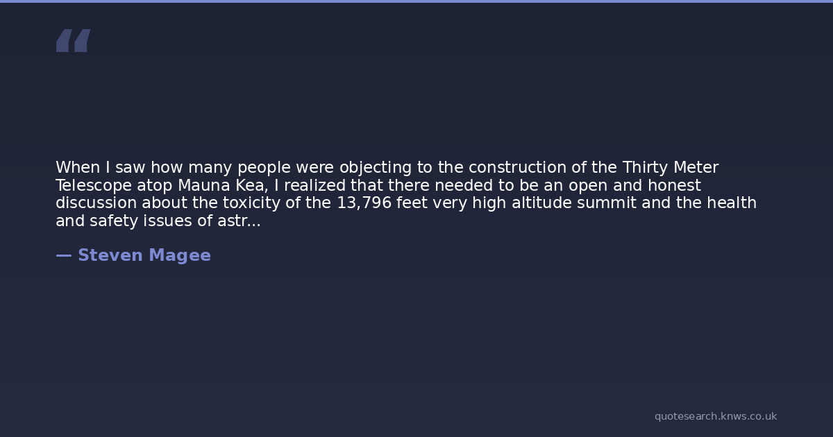 When I saw how many people were objecting to the construction of the Thirty Meter Telescope atop Mauna Kea, I realized that there needed to be an open and honest discussion about the toxicity of the 13,796 feet very high altitude summit and the health and safety issues of astronomical observatories.