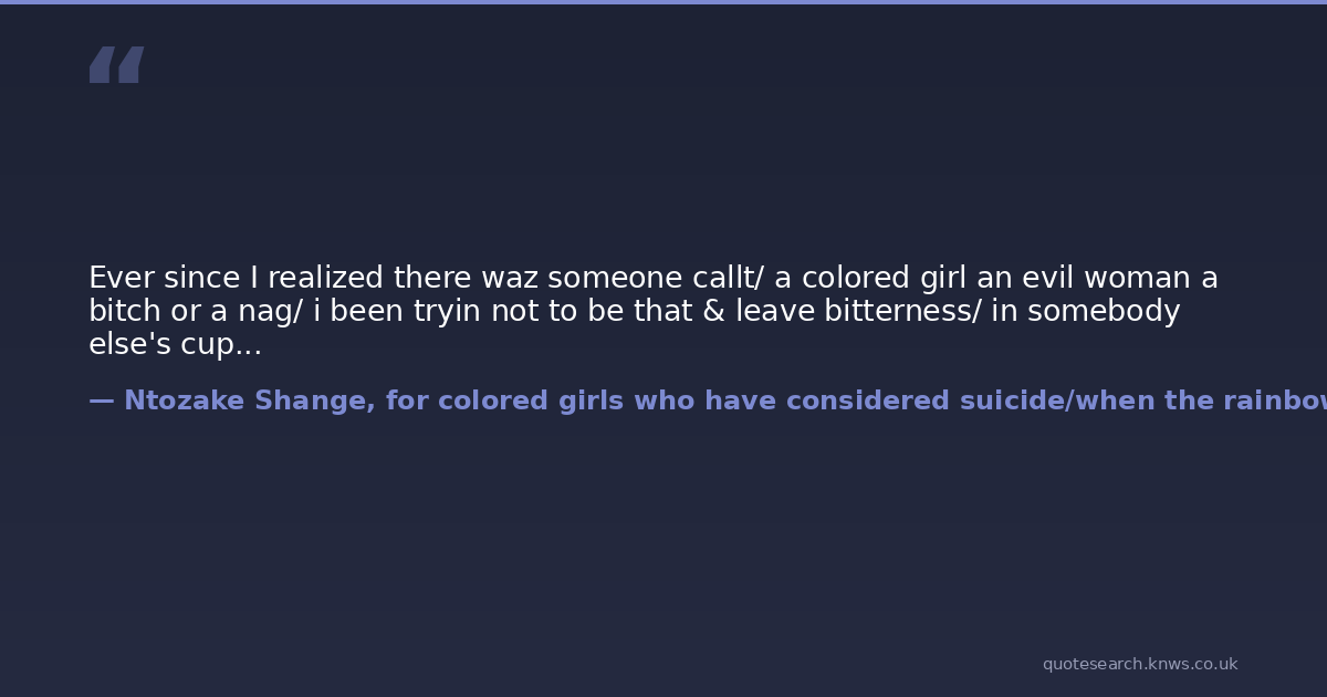 Ever since I realized there waz someone callt/ a colored girl an evil woman a bitch or a nag/ i been tryin not to be that & leave bitterness/ in somebody else's cup...