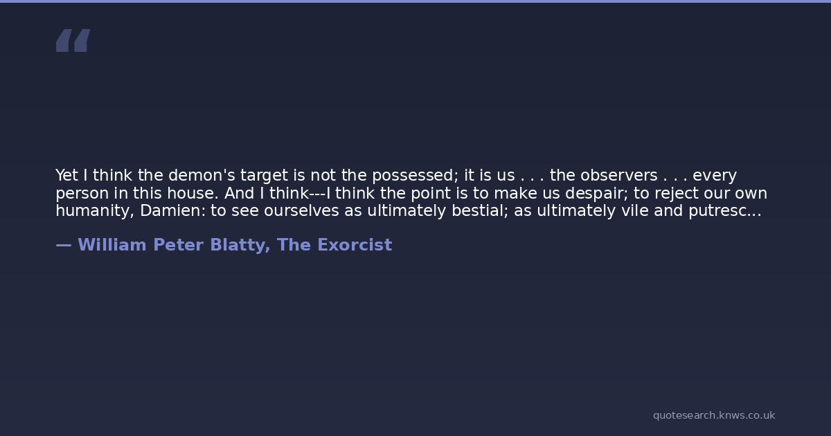 Yet I think the demon's target is not the possessed; it is us . . . the observers . . . every person in this house. And I think---I think the point is to make us despair; to reject our own humanity, Damien: to see ourselves as ultimately bestial; as ultimately vile and putrescent; without dignity; ugly; unworthy.