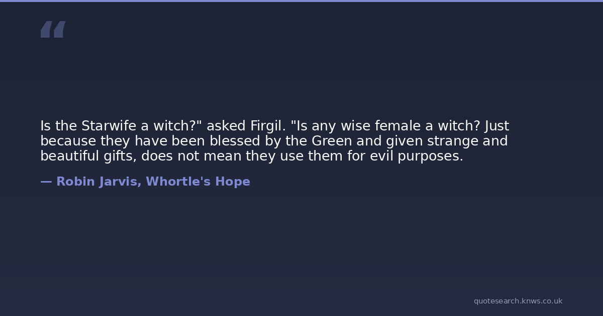 Is the Starwife a witch?" asked Firgil. "Is any wise female a witch? Just because they have been blessed by the Green and given strange and beautiful gifts, does not mean they use them for evil purposes.