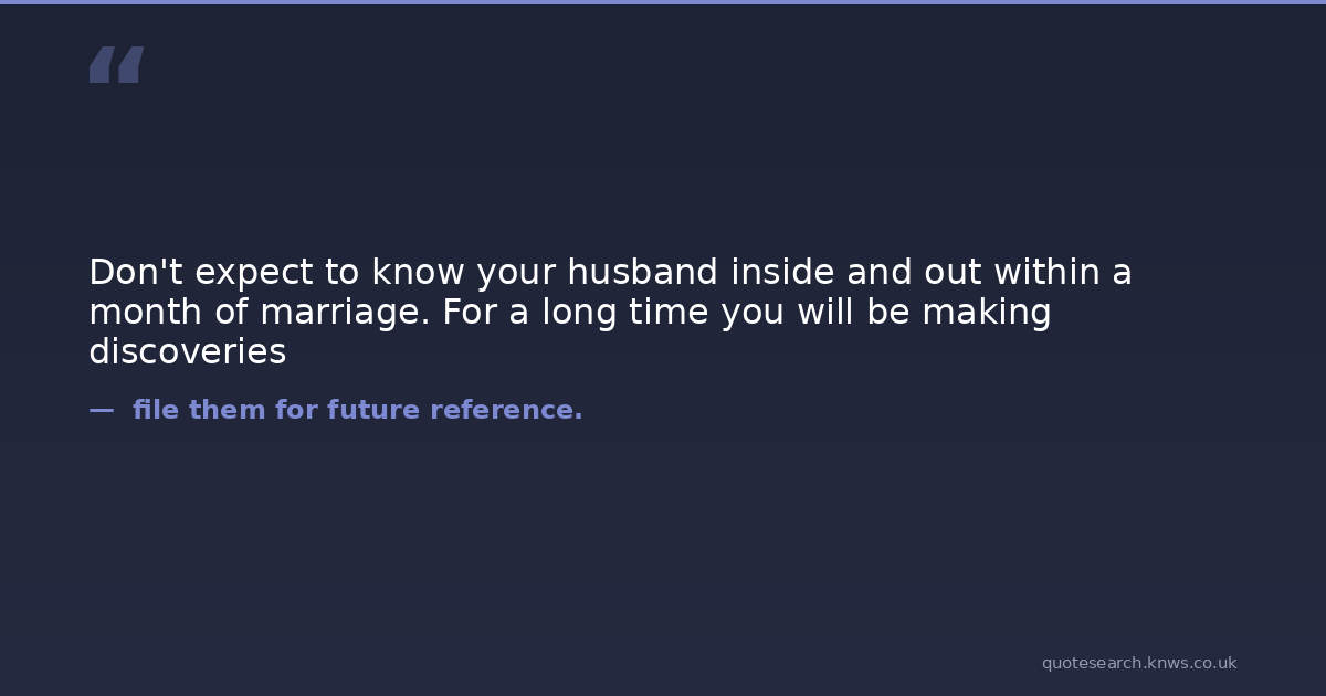 Don't expect to know your husband inside and out within a month of marriage. For a long time you will be making discoveries Blanche Ebbutt Don'ts for Wives Download Image Share on X Share on Facebook Copy Link