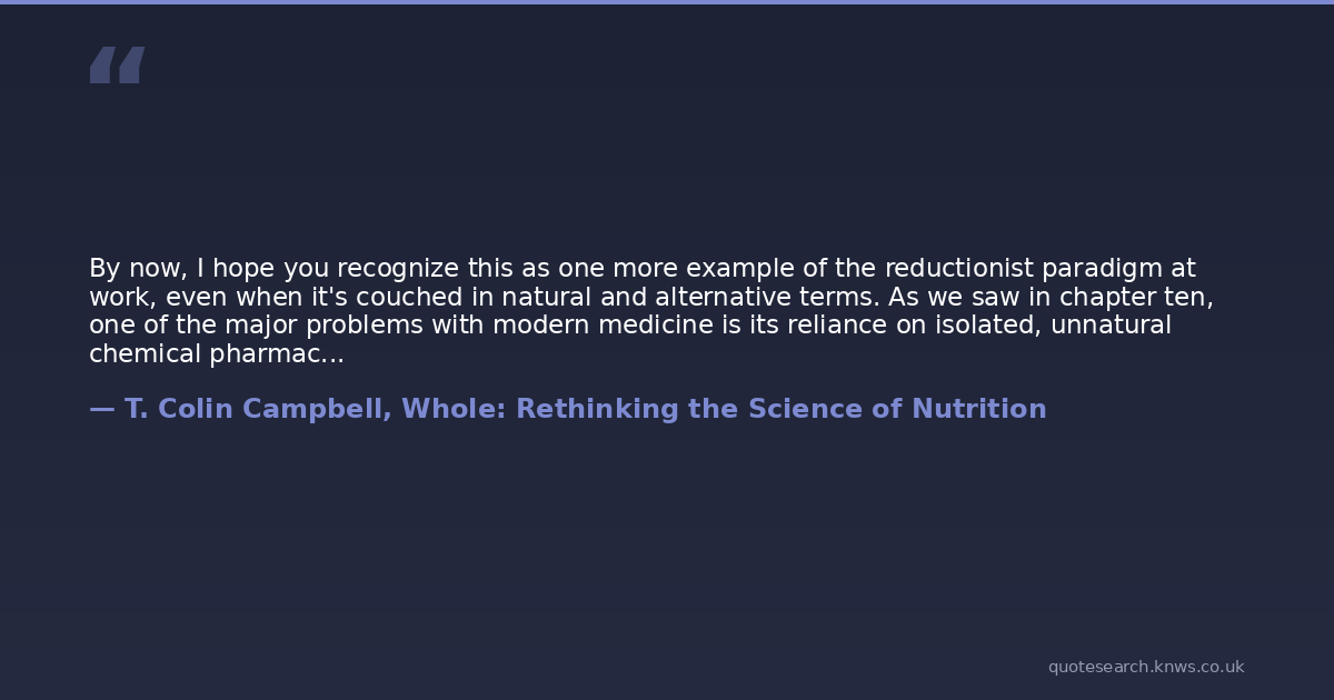 By now, I hope you recognize this as one more example of the reductionist paradigm at work, even when it's couched in natural and alternative terms. As we saw in chapter ten, one of the major problems with modern medicine is its reliance on isolated, unnatural chemical pharmaceuticals as the primary tool in the war against disease. But the medical profession isn't the only player in the health-care system that has embraced this element of reductionism. The natural health community has also fallen prey to the ideology that chemicals ripped from their natural context are as good as or better than whole foods. Instead of synthesizing the presumed "active ingredients" from medicinal herbs, as done for prescription drugs, supplement manufacturers seek to extract and bottle the active ingredients from foods known or believed to promote good health and healing. And just like prescription drugs, the active agents function imperfectly, incompletely, and unpredictably when divorced from the whole plant food from which they're derived or synthesized.