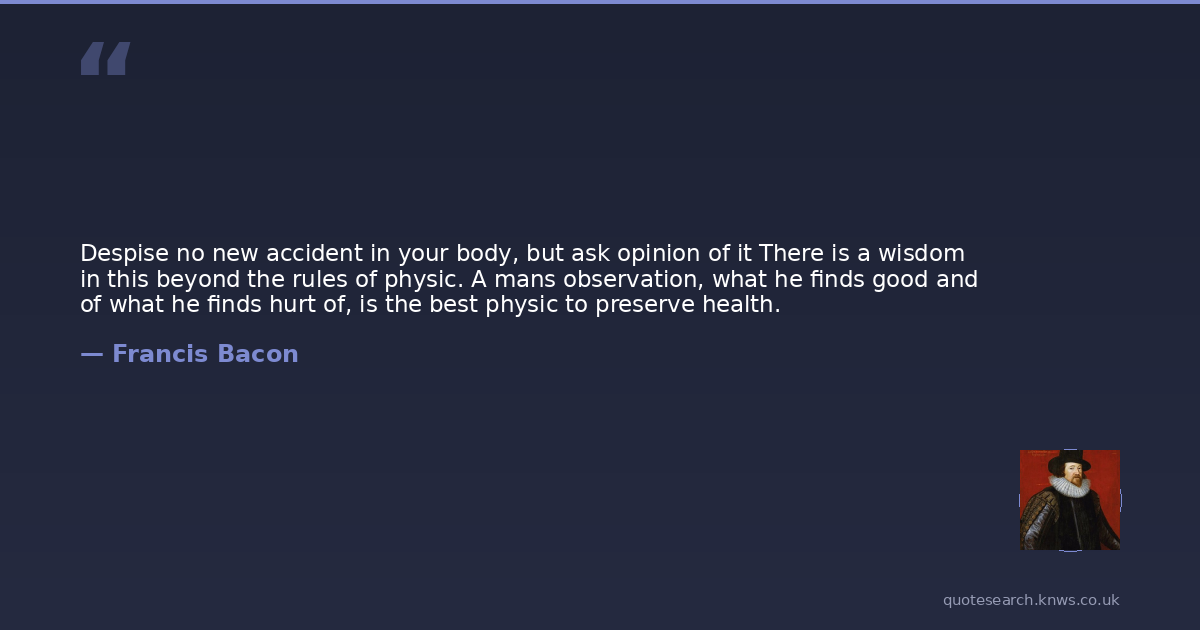 Despise no new accident in your body, but ask opinion of it There is a wisdom in this beyond the rules of physic. A mans observation, what he finds good and of what he finds hurt of, is the best physic to preserve health.