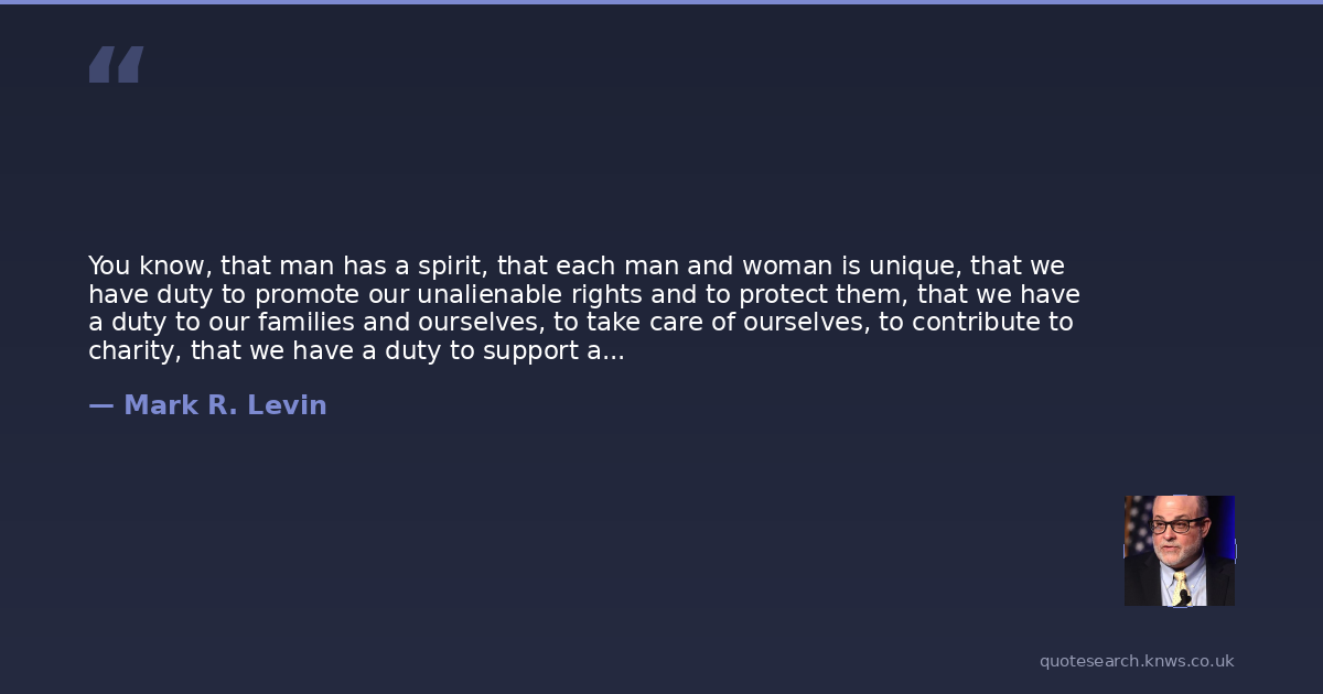 You know, that man has a spirit, that each man and woman is unique, that we have duty to promote our unalienable rights and to protect them, that we have a duty to our families and ourselves, to take care of ourselves, to contribute to charity, that we have a duty to support a just and righteous law that is stable and predictable.