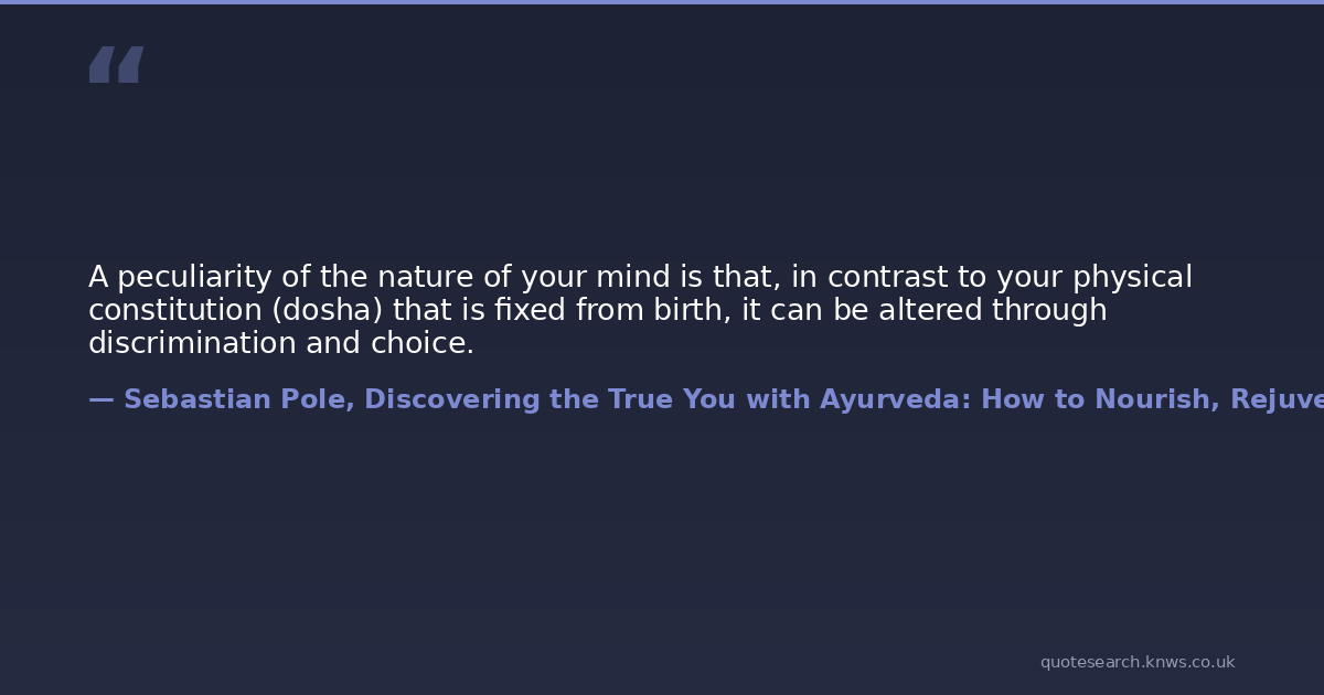 A peculiarity of the nature of your mind is that, in contrast to your physical constitution (dosha) that is fixed from birth, it can be altered through discrimination and choice.