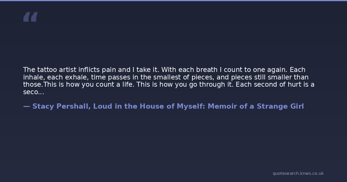 The tattoo artist inflicts pain and I take it. With each breath I count to one again. Each inhale, each exhale, time passes in the smallest of pieces, and pieces still smaller than those.This is how you count a life. This is how you go through it. Each second of hurt is a second that's already passed, one you never have to go through again. I have counted in pieces that small, when walking from the bed to the fridge seemed an insurmountable goal. I have counted my breaths, my steps, my eye-blinks, my hiccups, the tiny pulse in my thumb. And when I started getting tattooed, two of the things I used to need were gone: to write on myself, and to find irrelevant things to count. A second of intense pain is the most profound thing you can live through. And another, and another, and another, and then you know what it is to feel, and to struggle through that feeling one small agonizing increment at a time, and if you know that, you know what it is to live with mental illness.