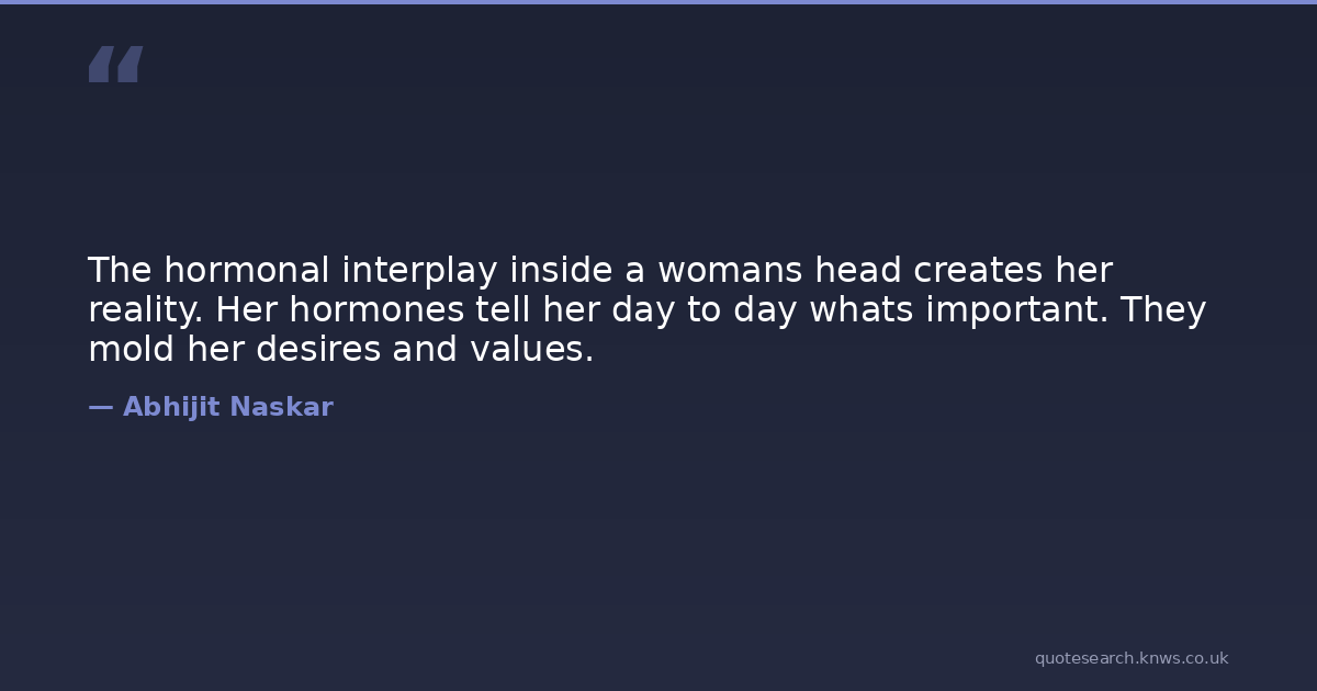 The hormonal interplay inside a womans head creates her reality. Her hormones tell her day to day whats important. They mold her desires and values.