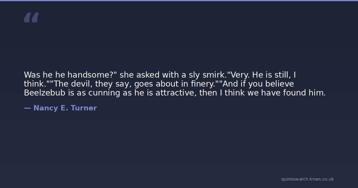 Was he he handsome?" she asked with a sly smirk."Very. He is still, I think.""The devil, they say, goes about in finery.""And if you believe Beelzebub is as cunning as he is attractive, then I think we have found him.