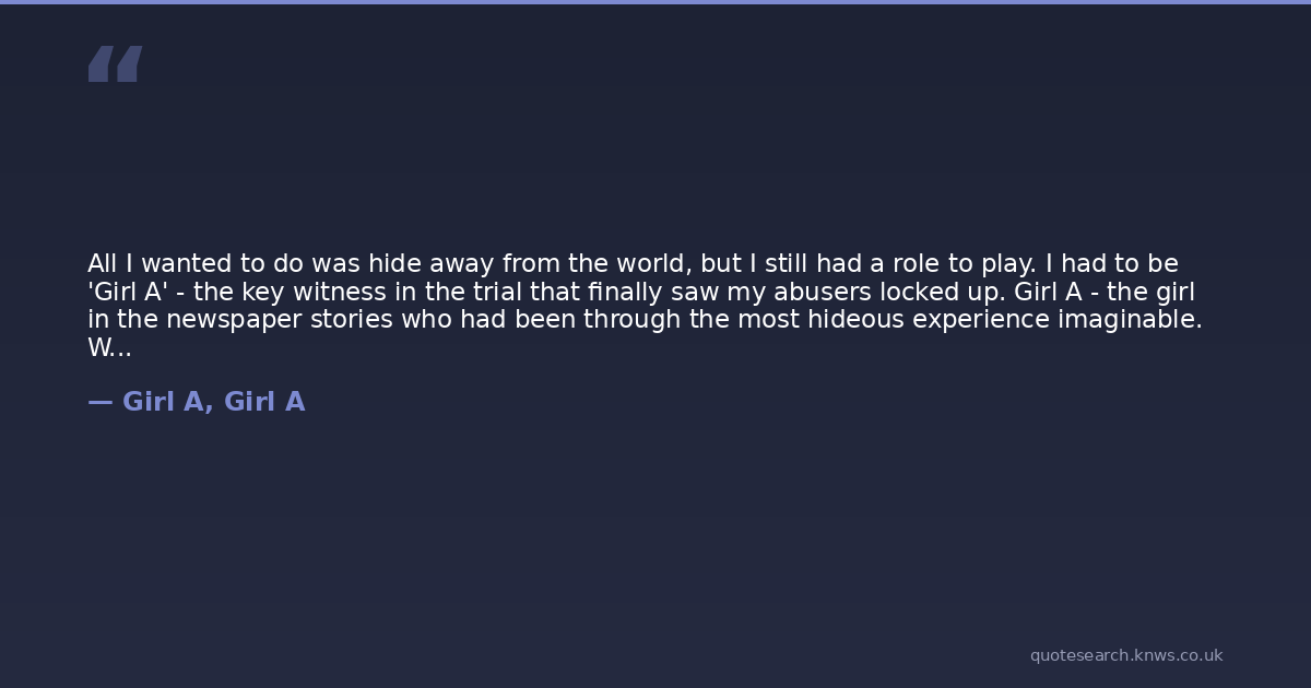 All I wanted to do was hide away from the world, but I still had a role to play. I had to be 'Girl A' - the key witness in the trial that finally saw my abusers locked up. Girl A - the girl in the newspaper stories who had been through the most hideous experience imaginable. When I read those stories, I felt like I was reading about somebody else, another girl who was subjected to the depths of human depravity. But it wasn't. It was about me. I am Girl A.
