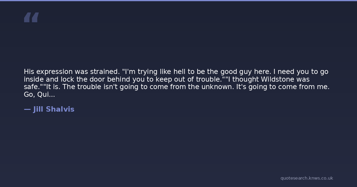 His expression was strained. "I'm trying like hell to be the good guy here. I need you to go inside and lock the door behind you to keep out of trouble.""I thought Wildstone was safe.""It is. The trouble isn't going to come from the unknown. It's going to come from me. Go, Quinn. Now. And lock your door."She stared up at him, mesmerized by the thought of him being trouble, images going through her head of him proving it to her, all of them involving little to no clothing and a bed.