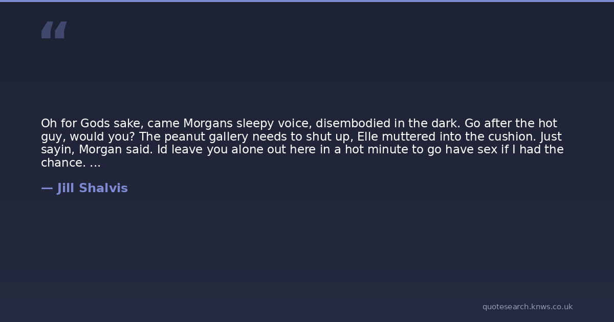 Oh for Gods sake, came Morgans sleepy voice, disembodied in the dark. Go after the hot guy, would you? The peanut gallery needs to shut up, Elle muttered into the cushion. Just sayin, Morgan said. Id leave you alone out here in a hot minute to go have sex if I had the chance. Im not going to go have sex while youre out here knowing Im having sex! Your loss, Morgan said. Oh my God, Elle said. Stop talking!